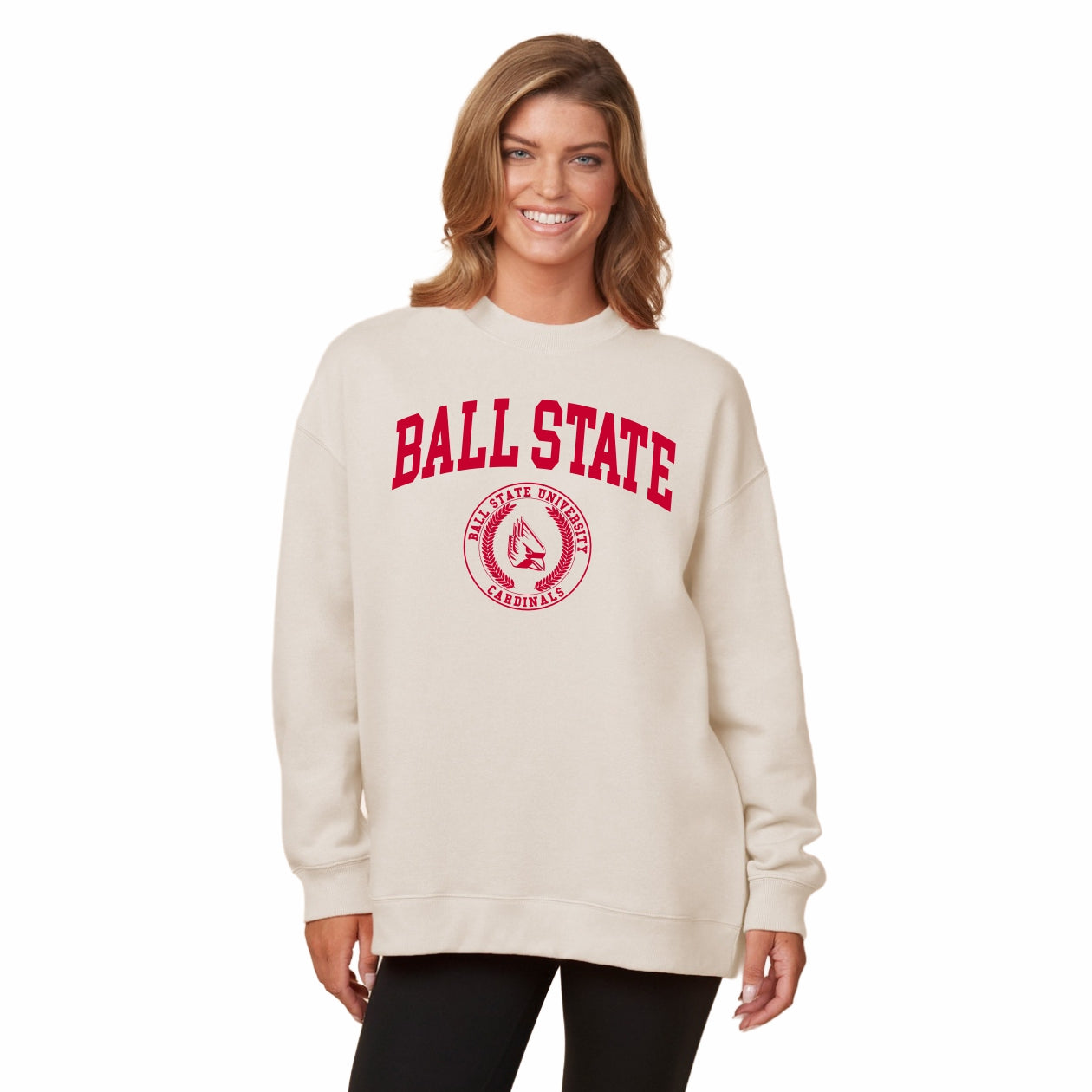 Chirp! Chirp! Pick up this Ball State sweatshirt to impress your friends! Once they see you wearing this fleece crewneck, they’re going to want one too! This sweatshirt features a tan body with a red "Ball State" arched over a University seal. It is perfect for showing your Ball State pride at games, tailgates, or around campus! This is an officially licensed collegiate product.