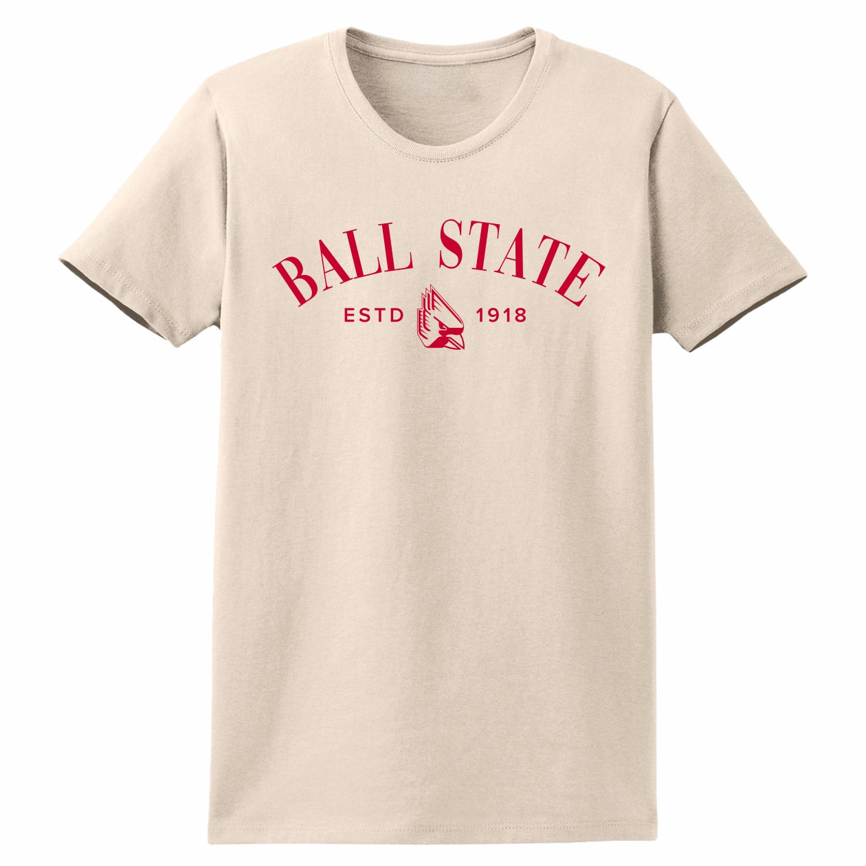 Go Cardinals! This Ball State t-shirt is a perfect way to show your Cardinal spirit. This women's tee features a tan body with a red "Ball State" puff print arch on the front that makes it great for campus wear, games, and more. Get this BSU shirt today to show off your Ball State pride! This is an officially licensed collegiate product.