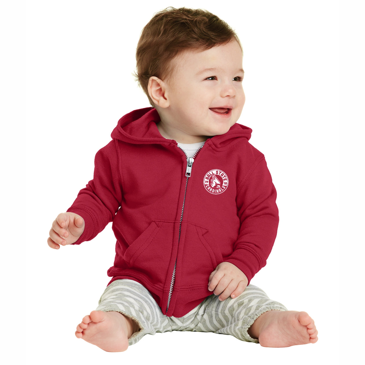 Go Cardinals! Get this Ball State hoodie and everyone will be able to see your little one's BSU pride! When your kiddo wears this Cardinals hoodie to the next game, they will stand out in the crowd! This infant hoodie features a red fleece body with a full-zip front and a white circular Ball State logo on the front. Get one today to show your little one's Cardinal spirit! This is an officially licensed collegiate product.