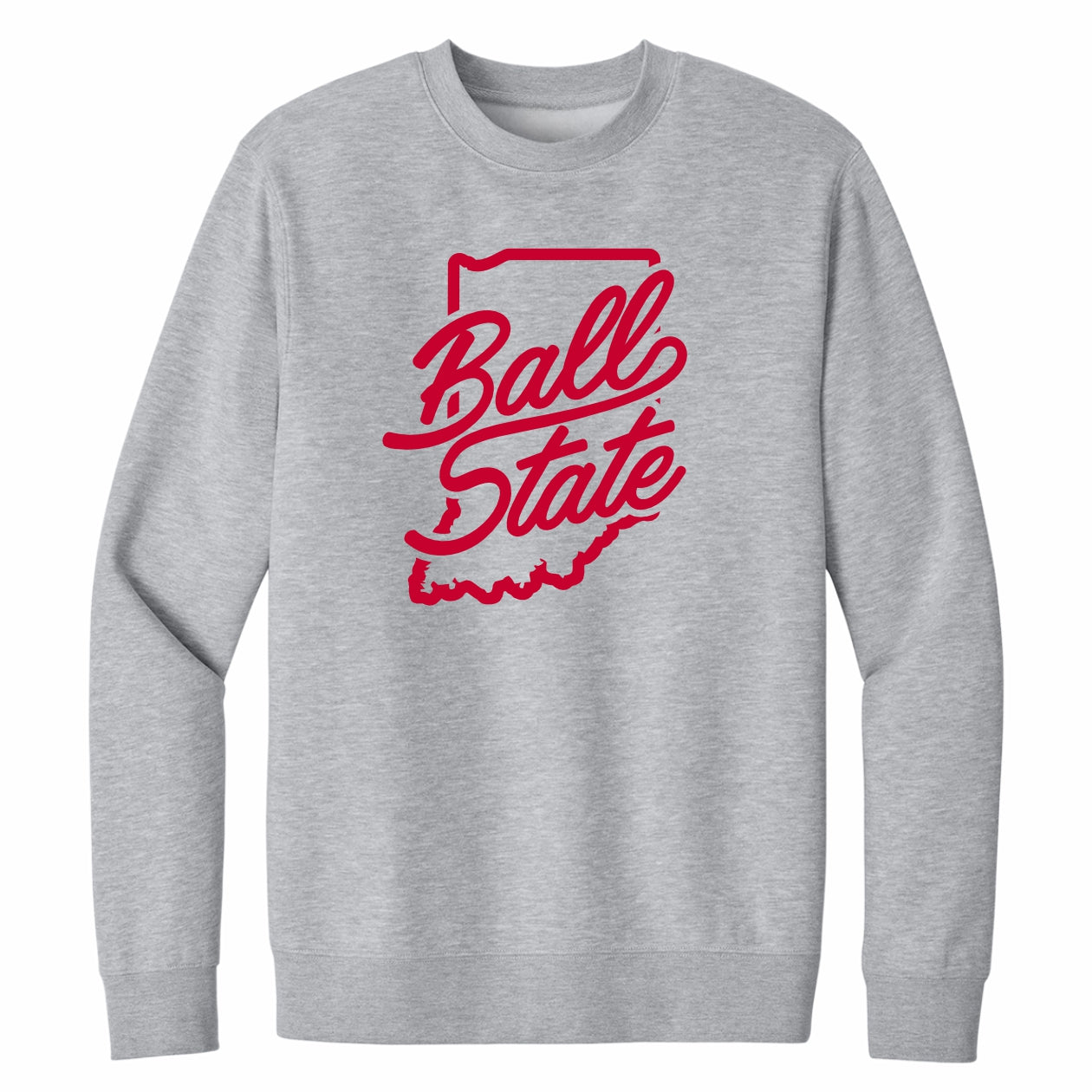 Go Cardinals! Get this Ball State sweatshirt and everyone will be able to see your BSU pride! When you wear this new pullover to the next game, you will stand out in the crowd! This sweatshirt features a grey fleece body with a red script "Ball State" inside a state shape outline. Get one today to show your Cardinal spirit! This is an officially licensed collegiate product.