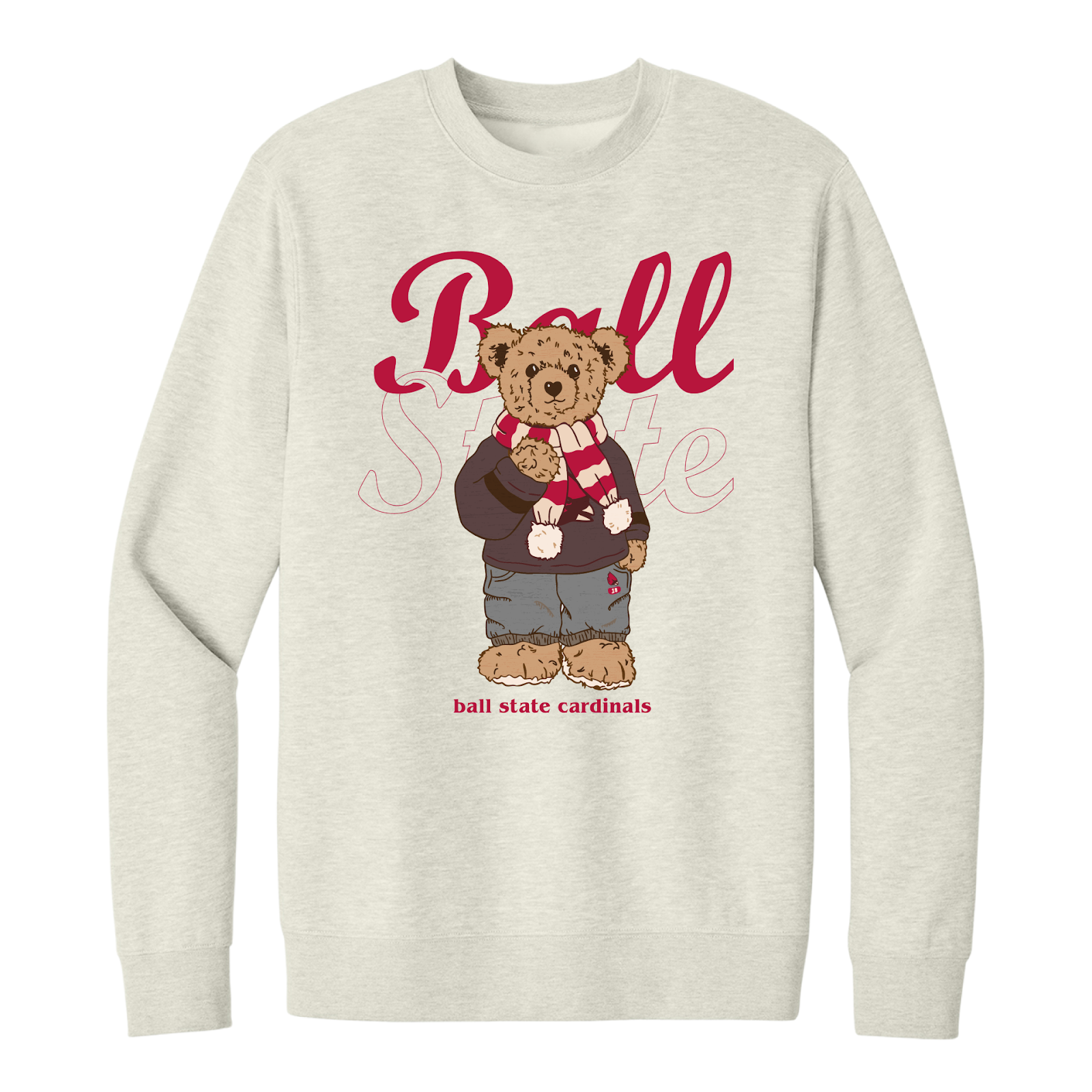 Go Cardinals! This Ball State sweatshirt is a perfect way to show your Cardinal spirit. This new fleece pullover features a light tan heather body with a fluffy bear wearing a sweater & striped scarf that makes it great for campus wear, games, and more. Get this new BSU piece today to show off your Ball State pride! This is an officially licensed collegiate product.