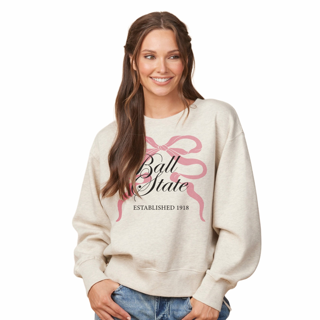 Go Cardinals! Get this Ball State sweatshirt and everyone will be able to see your BSU pride! When you wear this fleece crewneck to the next game, you will stand out in the crowd! This women's sweatshirt features a light tan body with a black script "Ball State" alongside a bow and "Established 1918" on the front. Get one today to show your Cardinal spirit! This is an officially licensed collegiate product.